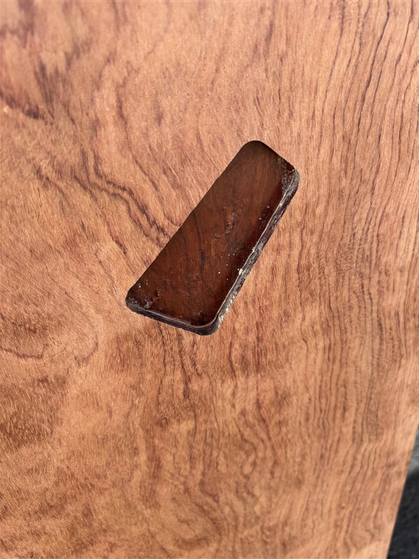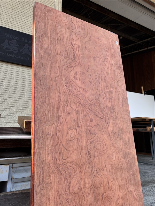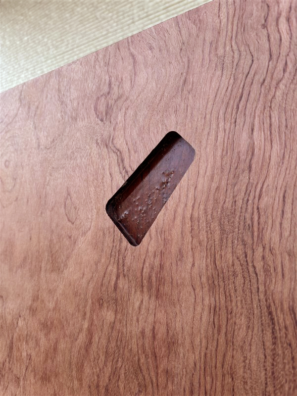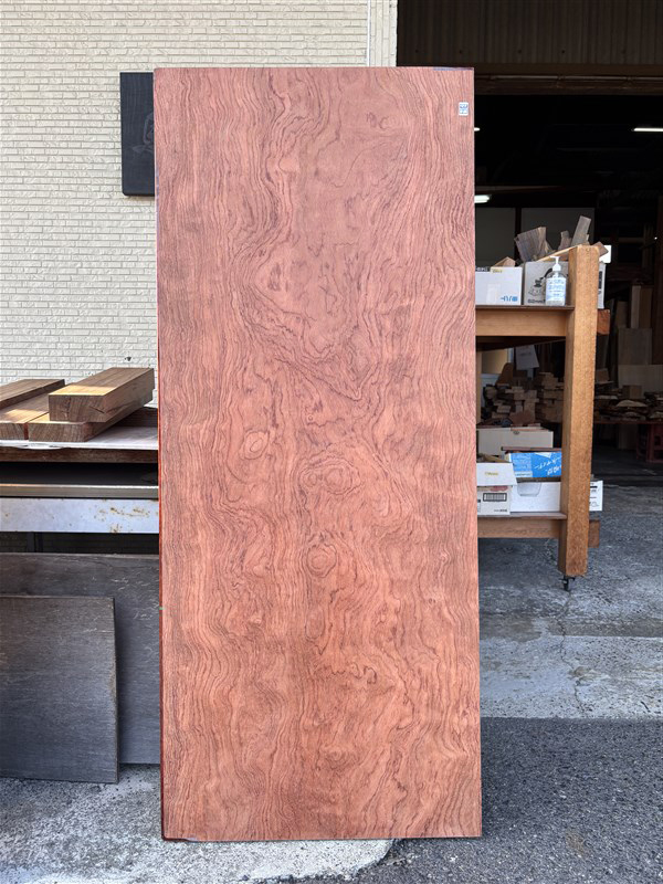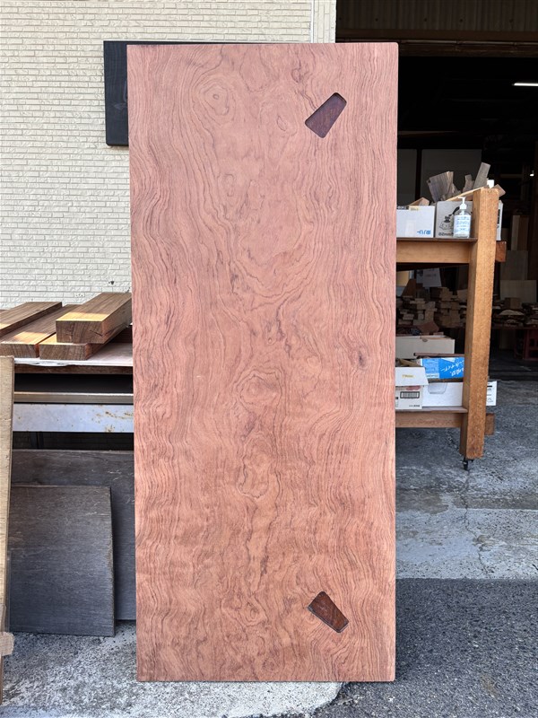 板の裏面に陥没した痕が見られますが、木表面は複雑な木目が独特な雰囲気をだしているブビンガ板です。硬い材質なので、表面を綺麗に仕上げますと、綺麗な光沢のある仕上がりになります。