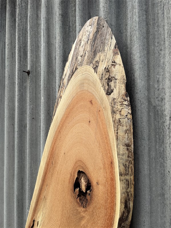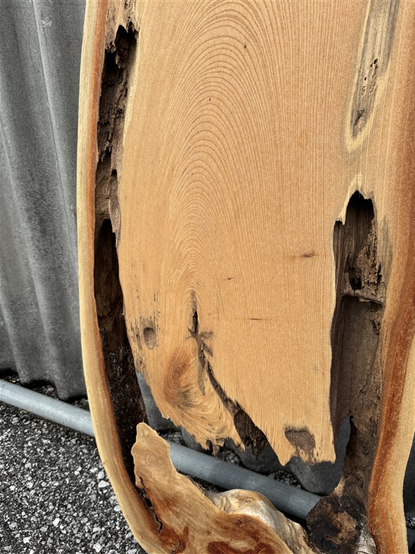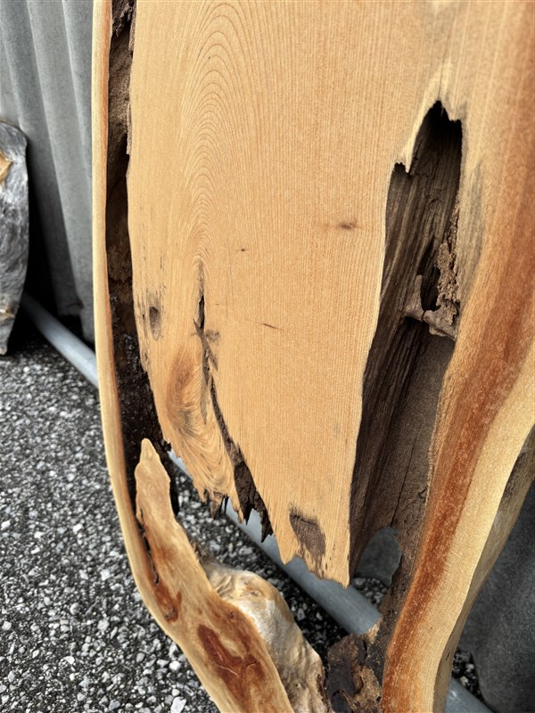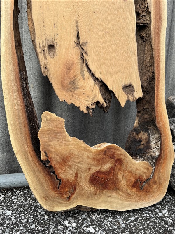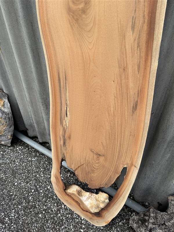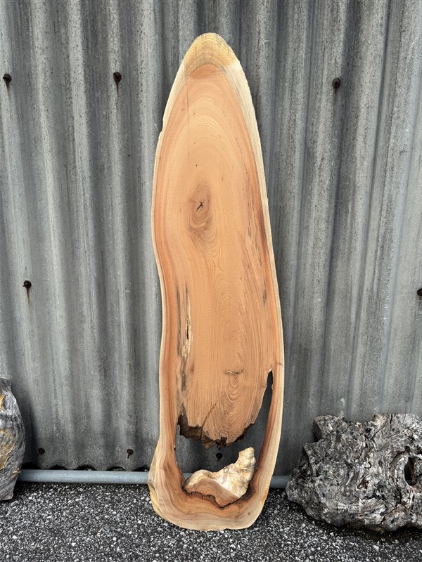 独特な形をした欅の一枚板です。空洞の部分にレジン等の樹脂で埋めて加工しますと、良い感じの雰囲気がでると思います。