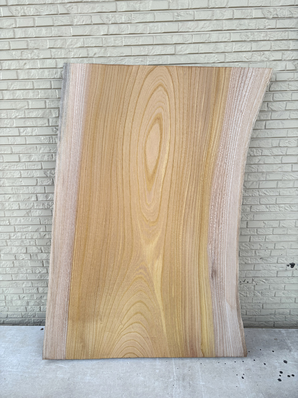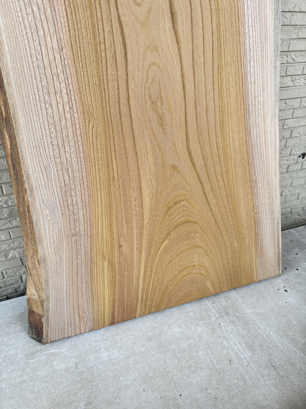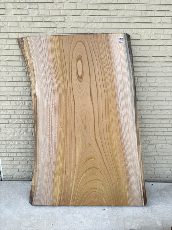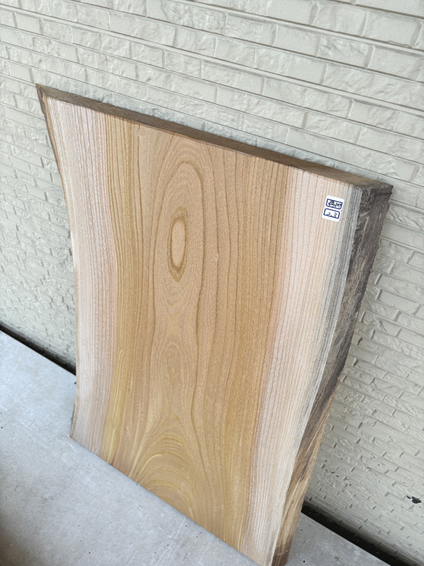 耳付きの自然な形が印象的なけやき板です。けやきらしい綺麗な木目をしています。